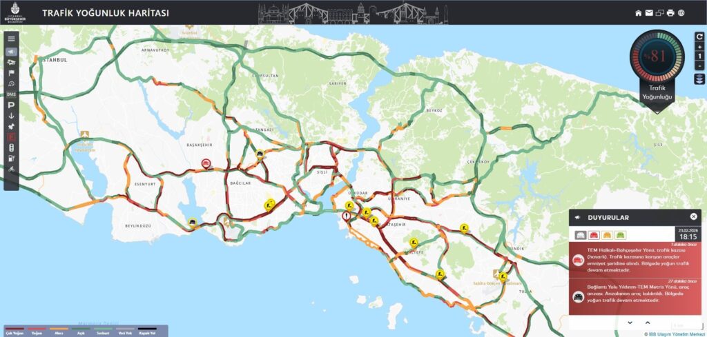 İstanbul’da akşam saatlerinde trafik yoğunluğu arttı. İBB Trafik Yoğunluğu Haritası verilerine göre saat 18.15 itibarıyla yoğunluk yüzde 81’e ulaştı. Kentteki